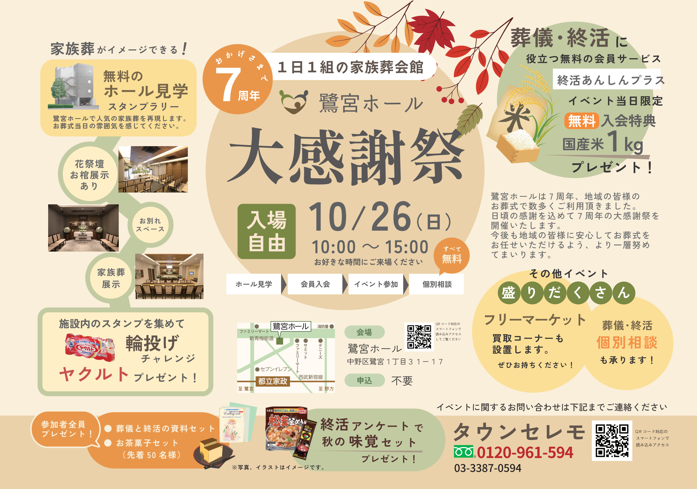 10月26日(日)10:00~15:00、鷺宮ホールにて 「鷺宮ホール7周年大感謝祭」を開催いたします。
