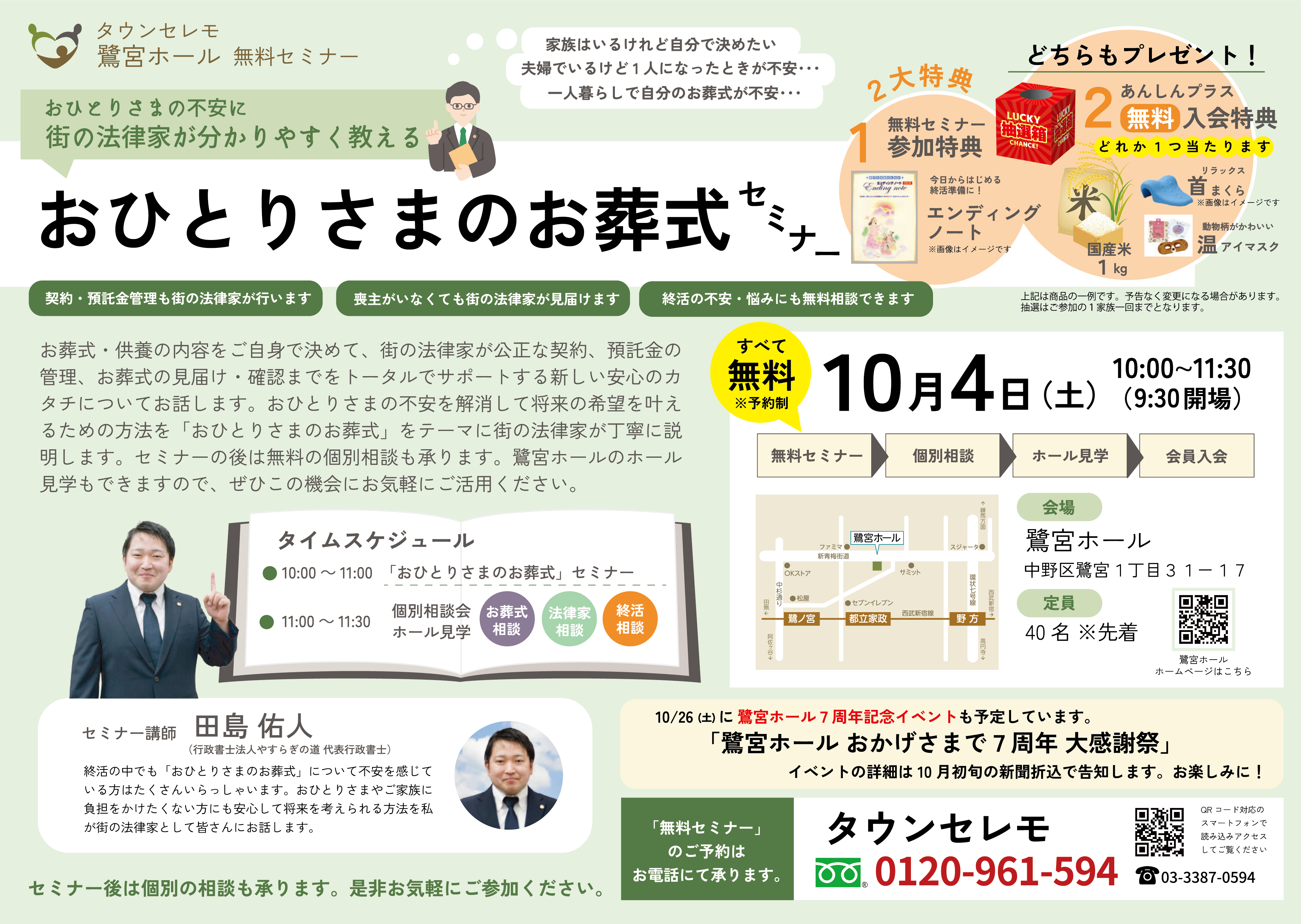 10月4日(土)10:00~11:00、鷺宮ホールにて 「おひとりさまのお葬式」セミナー を開催いたします。
